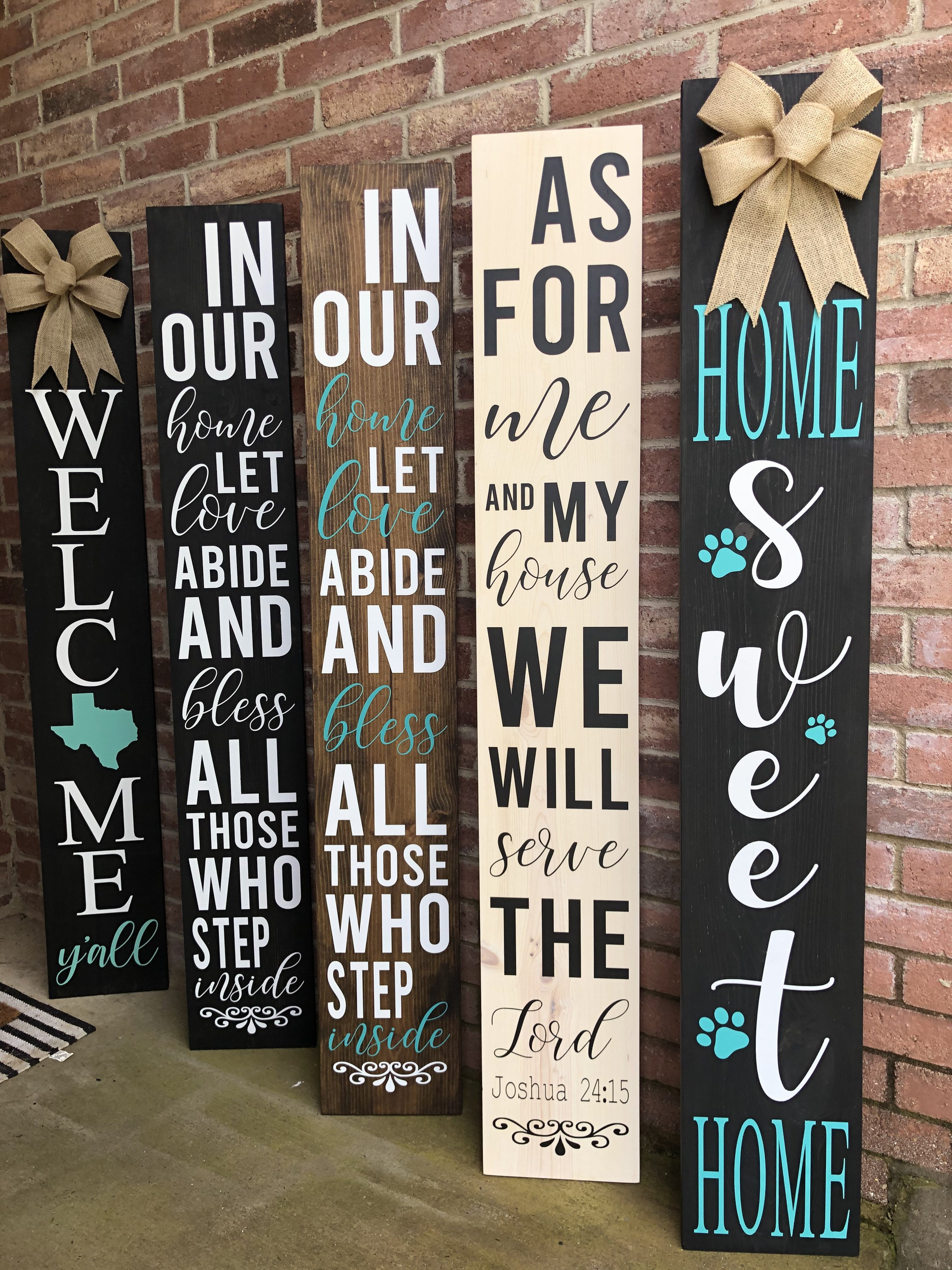 Our porch signs measure 5 FEET TALL and are 9.25 INCHES WIDE, made from solid pine wood. We offer several stain colors so there is a lot of variety to choose from! Due to the nature of wood, each wood sign is unique in its own way. Each piece of wood takes stain differently and can slightly differ in color. Knots and grain of the wood will vary with each piece which gives it such beautiful character. After we have stained the piece of wood, we then bring it to life by painting on the design! We achieve crisp clean lines every time we paint, and the sign just turns out so beautiful!